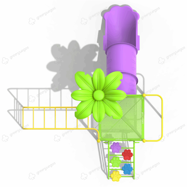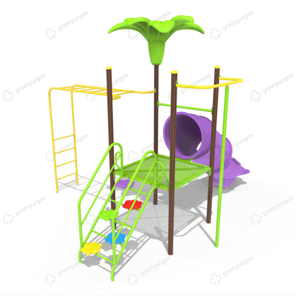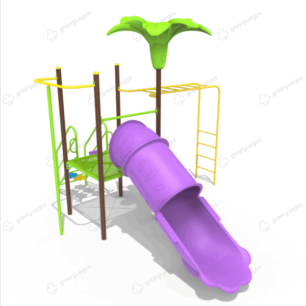 1 Torre premium con palmera decorativa-Escalera trepadora con patas de oso- 1 Tobogán cerrado fabricado en rotomoldeo-1 Pasamanos recto- 1 tubo de bombero.-