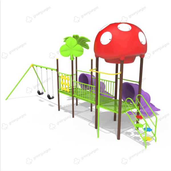 2 Torre premium con palmera decorativa-Trébol-Caño bombero-Escalera trepadora con patas de oso-Panel TA-TE-TI-Pórtico con dos hamacas-Puente- 2 Toboganes tubo cerrado de rotomoldeo 75 cm diámetro- 1 Techo con forma de hongo gigante en segunda torre fabricado en rotomoldeo.-