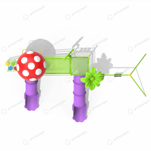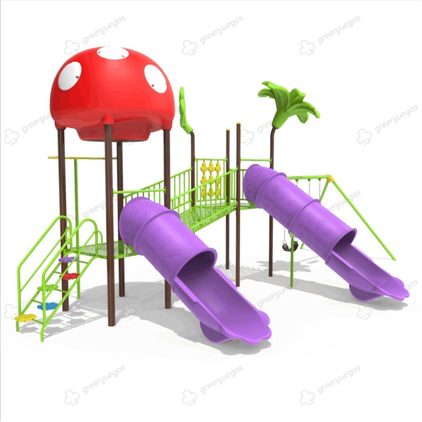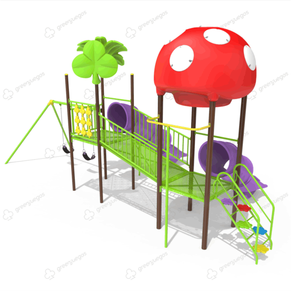 2 Torres premium con palmera decorativa-Trebol-Caño bombero-Panel TATETI-Pórtico con dos hamacas-Escalera trepadora con patas de oso-Puente fijo con barandas- 1 Tobogán tubo chico cerrado de rotomoldeo 75 cm diámetro -1 Tobogán tubo mediano cerrado de Rotomoldeo 75 cm diámetro en segunda altura- 1 Techo en segunda torre fabricado en Rotomoldeo.-