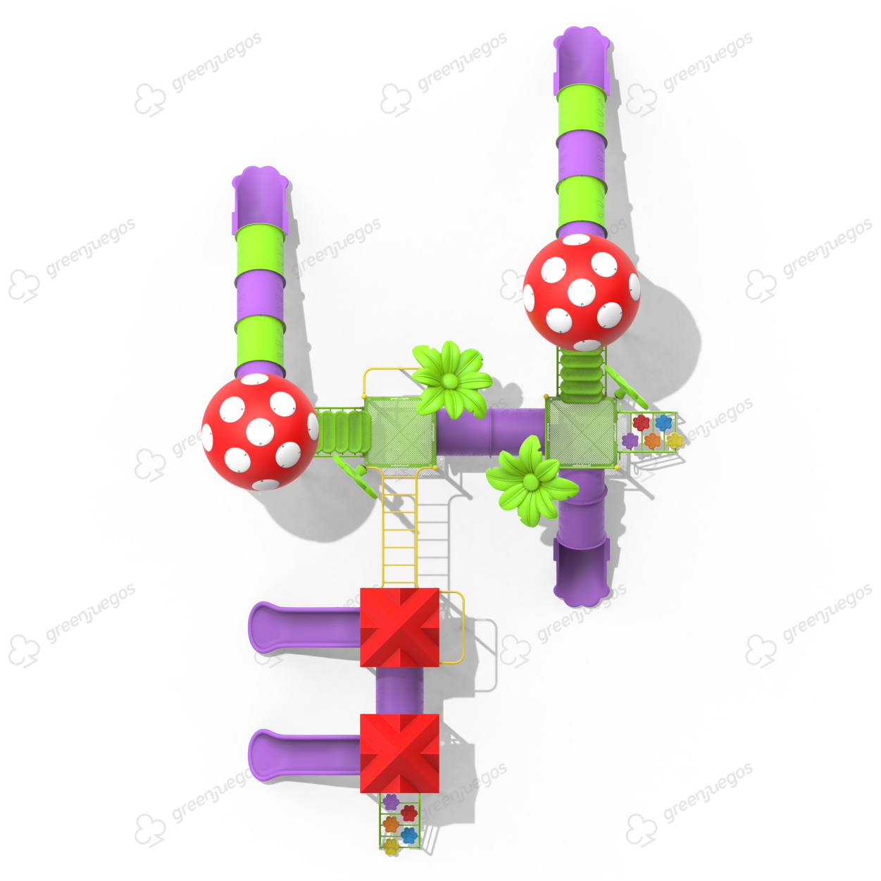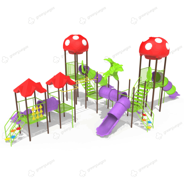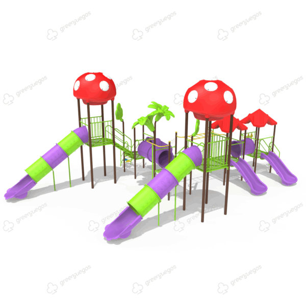 2 Torres con techos en forma de hongos, cada torre posee escaleras intermedias cerradas y barandas reglamentarias – 2 Toboganes tubo largo de rotomoldeo 0,75 cm diámetro; 2 Torres unidas a las torres gigantes detalladas anteriormente con 2 palmeras y 2 tréboles decorativos fabricados en rotomoldeo. Una de las torres contiene un tobogán tubo chico de rotomoldeo 0,75 cm diámetro y la otra torre un pasamanos recto. Ambas unidas por un puente tubo de rotomoldeo 0,75 cm diámetro y de 2 mtrs de largo; 2 Torres bajas con techo de rotomoldeo de moderno diseño, 2 toboganes abiertos fabricados en rotomoldeo, Puente cerrado con baranda, 1 panel TA-TE-TI y una escalera de ingreso cerrada.