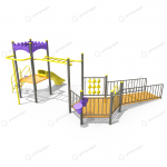Mangrullo tipo rampa – hexágono de giro con tambores musicales – Volante integrador y Panel TaTeTi. Unido Por pasamanos recto a un mangrullo 1 Torre Imperial, bandera decorativa – Tobogán abierto de rotomoldeo – Escalera de ingreso con peldaños de rotomoldeo en forma de patas oso.