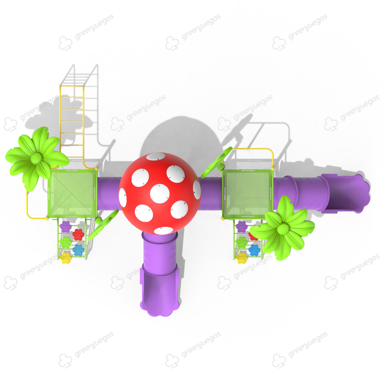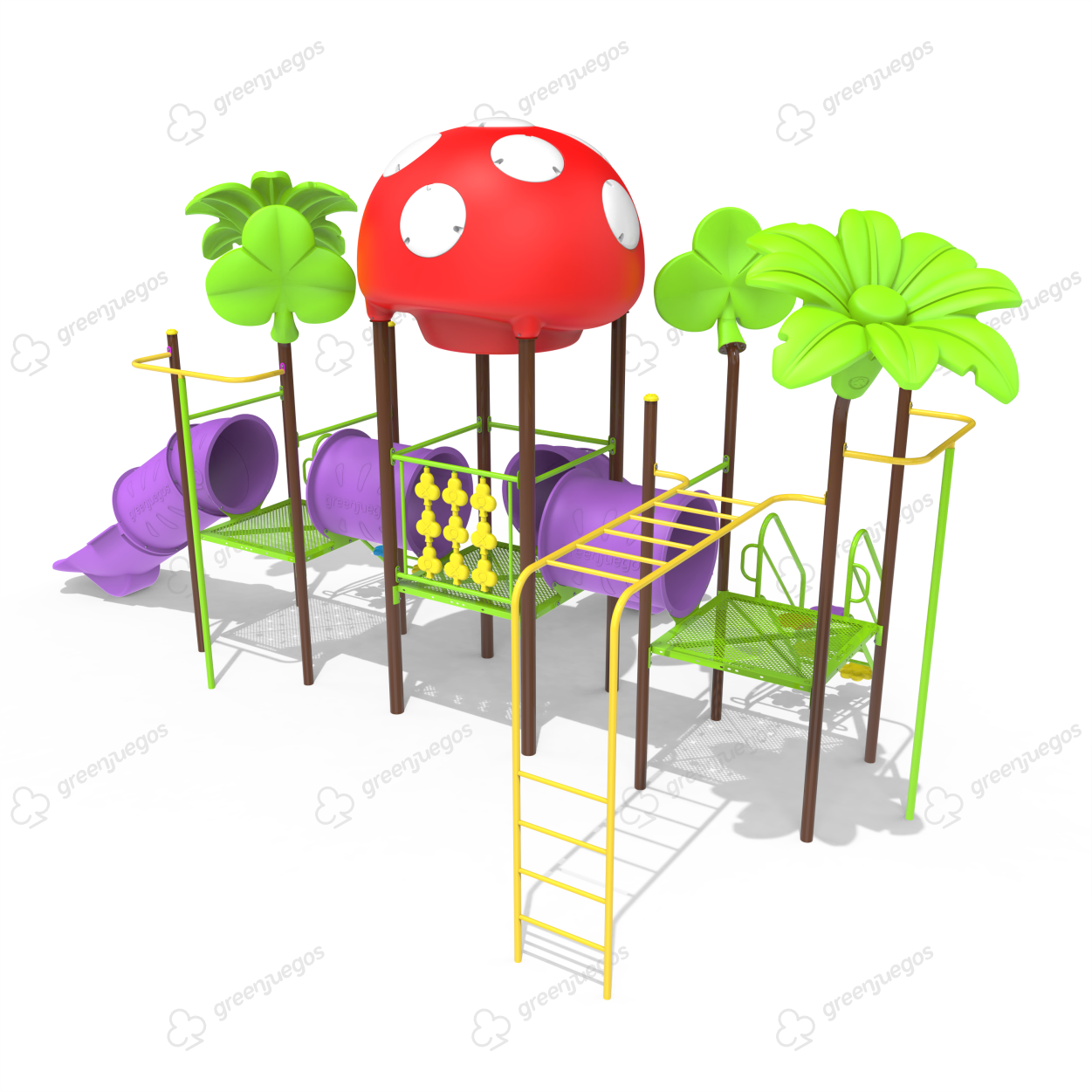 3 Torres premium con palmera decorativa-Trebol-2 Escaleras trepadoras con patas de oso-Pasamanos-Escalera trepadora- 2 Toboganes tubo cerrado de rotomoldeo 75 cm diámetro- 2 Puentes tubo- 1 Panel sensorial TA-TE-TI- 2 Caños Bombero- 1 Techo en forma de hongo gigante en la segunda torre fabricado en Rotomoldeo.-