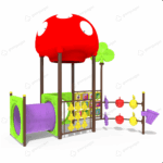 Mangrullo para primera infancia, con panel ta te ti, panel de la memoria, tambores, túnel, frutas móviles y trébol.