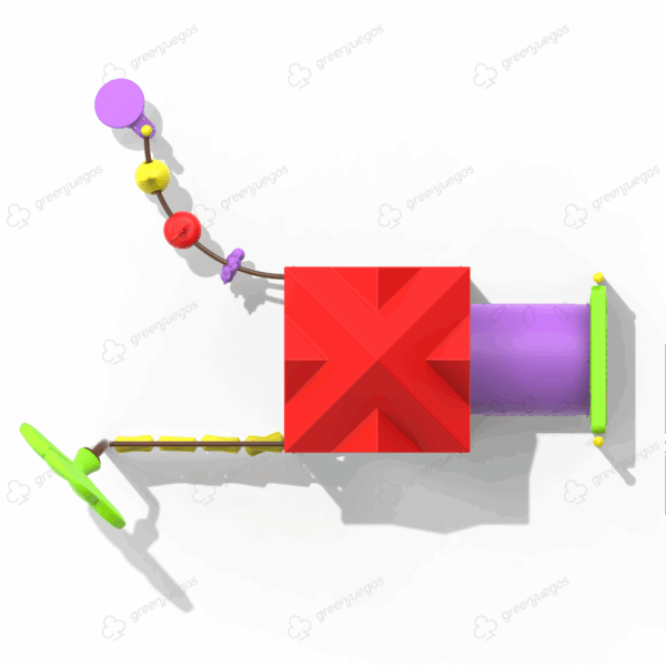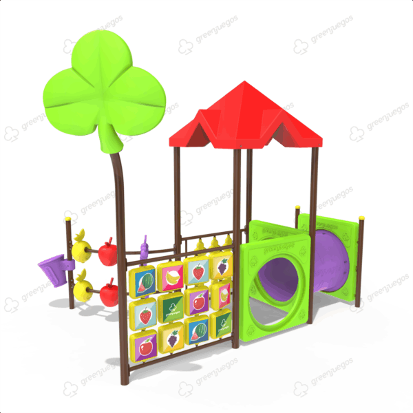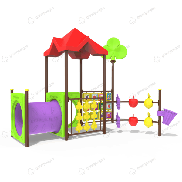 Mangrullo para primera infancia, con panel ta te ti, panel de la memoria, tambores, túnel, frutas móviles y trébol.