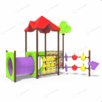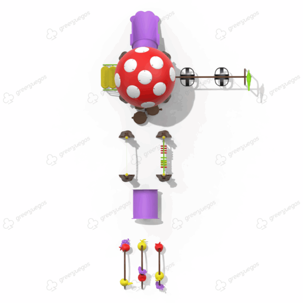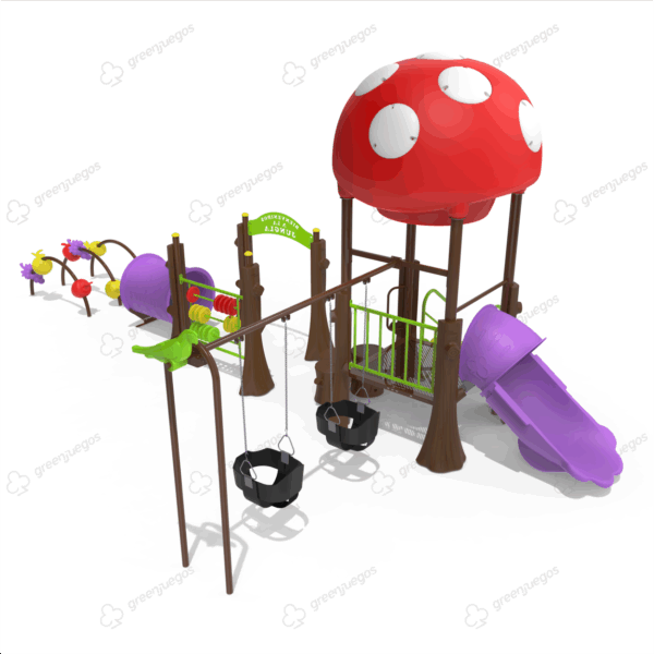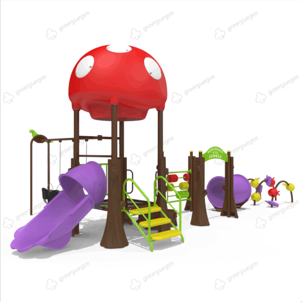 Set para primera infancia conformado por un mangrullo con techo hongo con sus patas revestidas por patas tipo troncos de rotomoldeo, escalera de acceso con peldaños de rotomoldeo, un tobogán abierto, un pórtico doble bebé. Posee además mini troncos de rotomoldeo como transición hacia el panel ábaco, un tubo de gateo y arcos con frutas móviles. Tiene también un arco de bienvenida con ambas patas revestidas en simil tronco de rotomoldeo